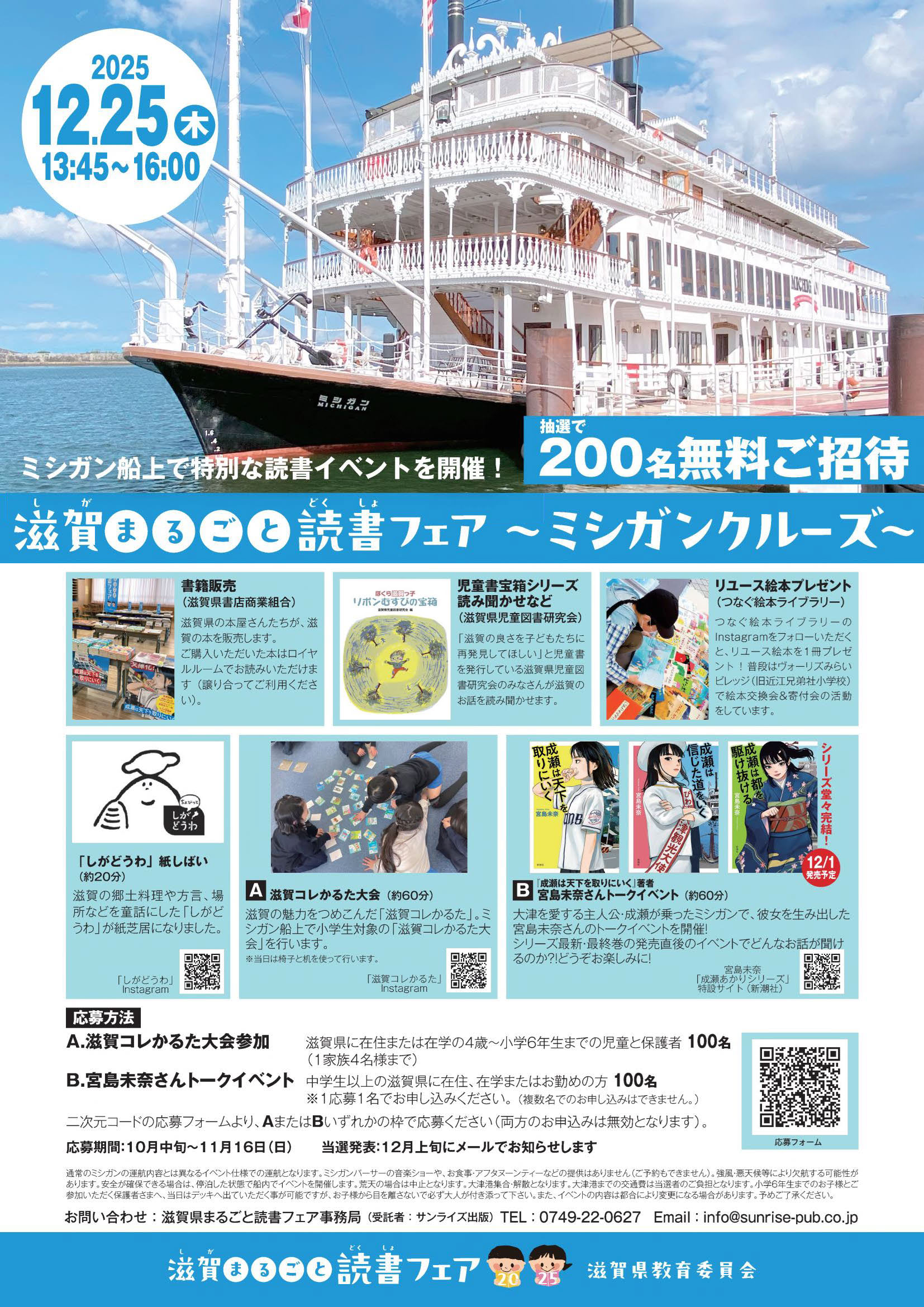 12月25日(木曜日)には2024年本屋大賞の「成瀬は天下を取りにいく」著者・宮島未奈さんをお招きして、小説の舞台となった「外輪船ミシガン」を借り切っての読書イベントを開催します。