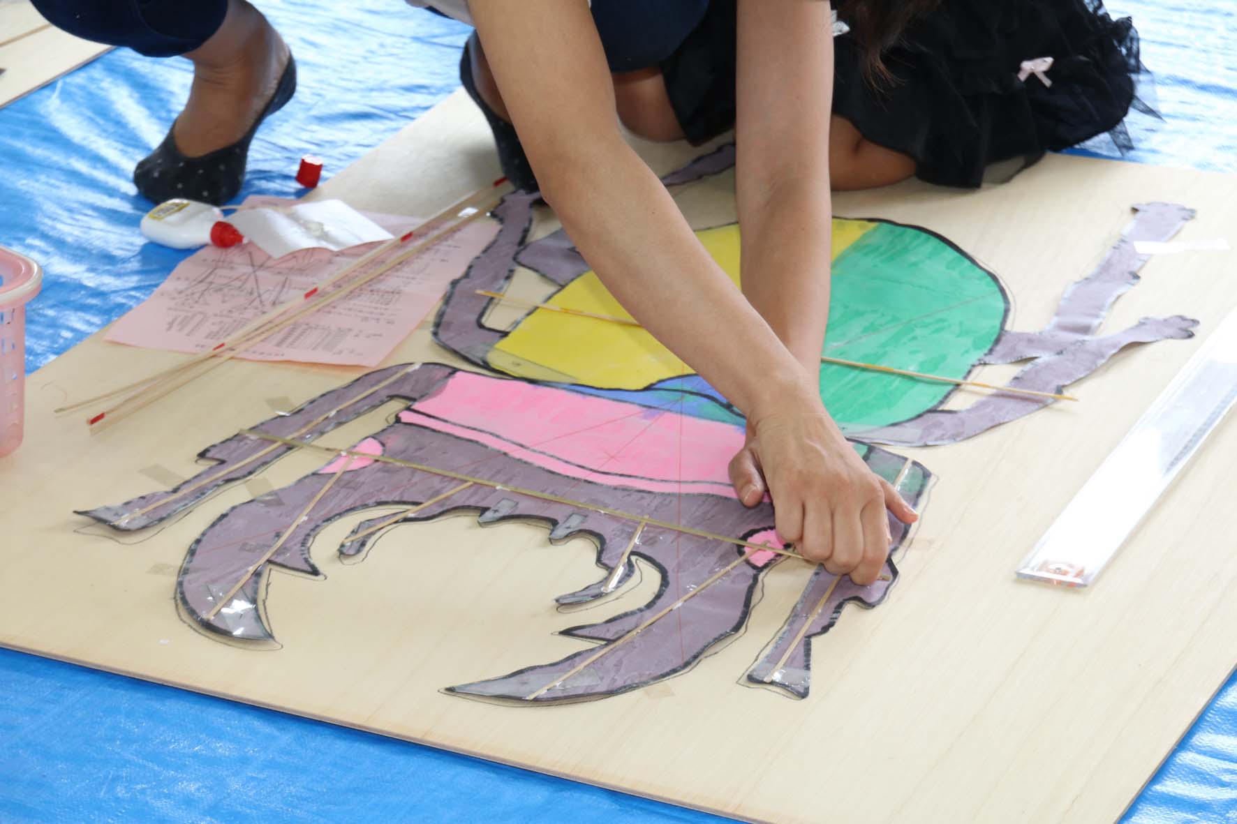 縦約90cmの大きさのクワガタムシの形に切り取られた紙に色を塗ります。絵が出来上がったら、骨組の竹を取り付け、あげ糸などを取り付けて完成です。親子で協力して作業を行い、約3時間の体験教室になります。