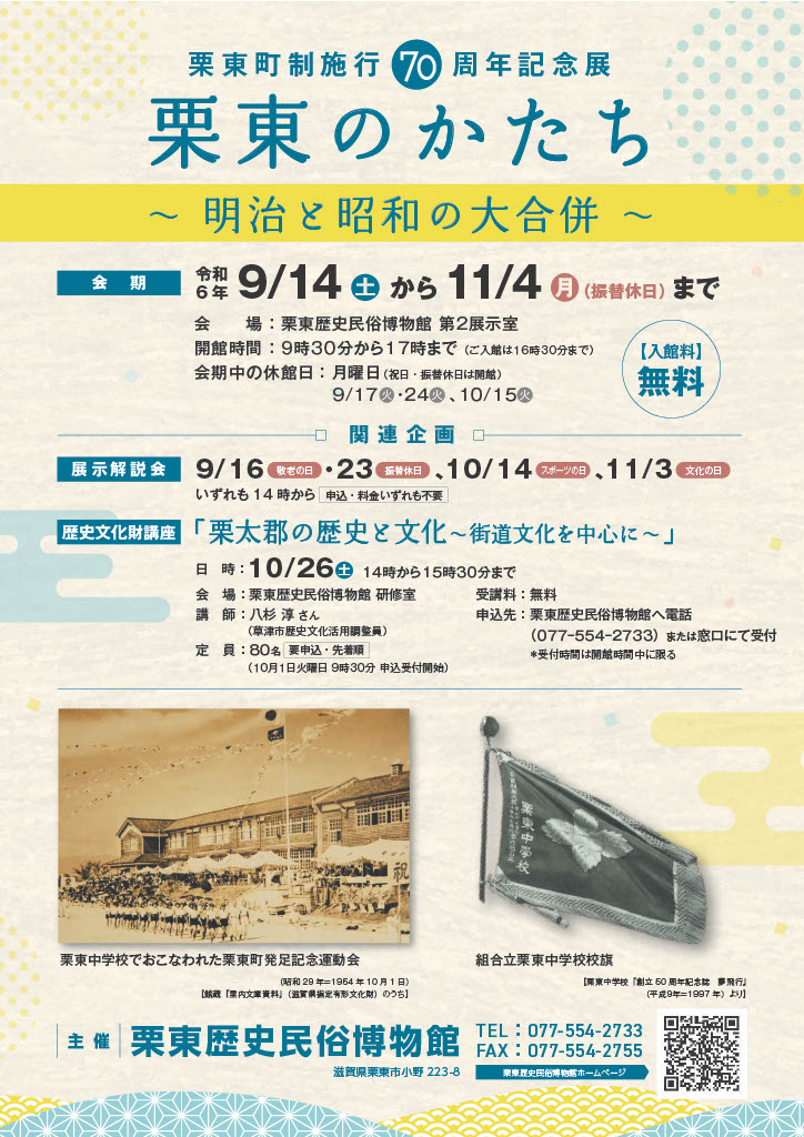 この展覧会では、“栗東”というまちの歴史が始まって70年にあたり、その輪郭が形成された明治と昭和の大合併を中心に、まちの成り立ちやあゆみを紹介します。
