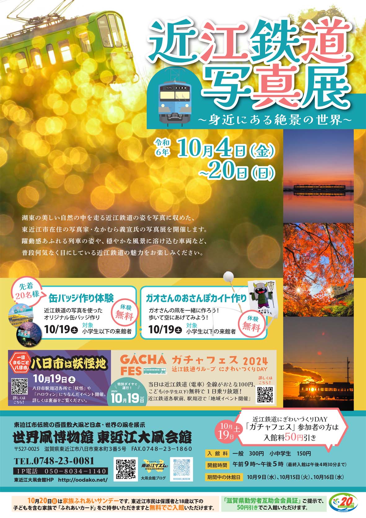 湖東の美しい自然の中を走る近江鉄道の姿を写真に収めた、東近江市在住の写真家・なかむら義宣氏の写真展「近江鉄道写真展〜身近にある絶景の世界〜」を開催します。躍動感あふれる列車の姿や、穏やかな風景に溶け込む車両など、普段何気なく目にしている近江鉄道の魅力をお楽しみください。ガチャフェスが行われる10月19日(土)には、来館された小学生以下の方を対象に、先着20名様限定で、近江鉄道の写真を使ったオリジナル缶バッジ作りワークショップを開催いたします。また、八日市駅周辺各所で「妖怪」や「ハロウィン」にちなんだイベント開催され、当館は来館された小学生以下の方を対象にガオさんのおさんぽカイト作りを行います。(無料)
