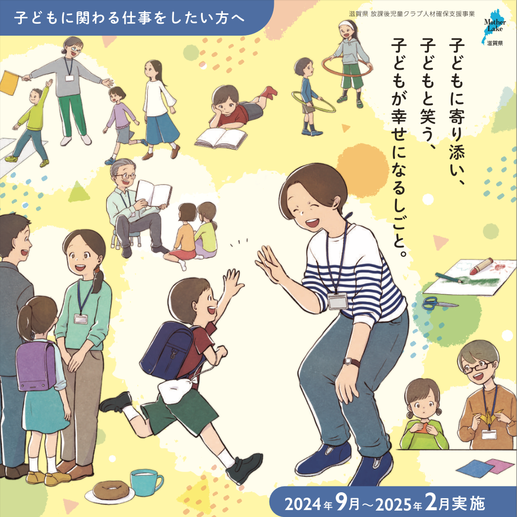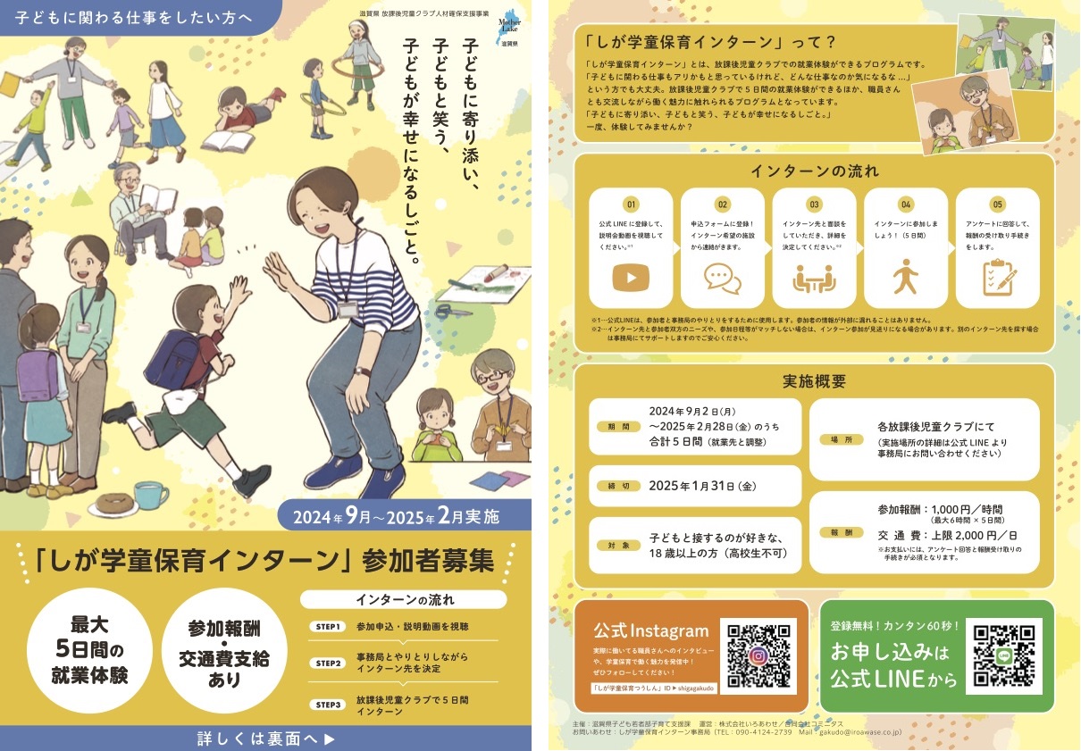 放課後児童クラブ(学童保育)を利用する子どもの安全を確保し、質の高い保育を提供するため、放課後児童支援員の魅力を発信し、社会的評価の向上と就労ニーズの掘り起こす事業の一環として「しが学童保育インターン(職場体験事業)」を実施します。