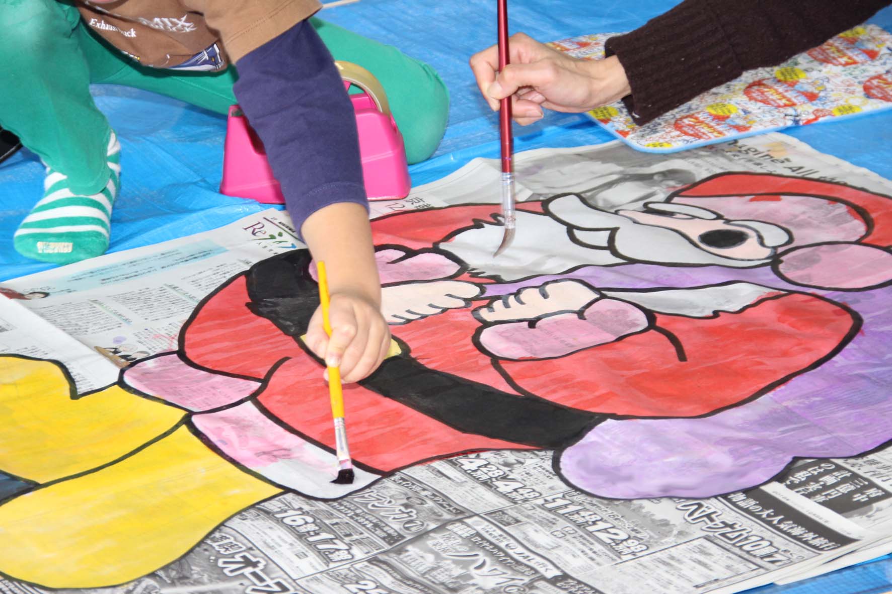 サンタクロースの形をした和紙に、絵具を使って好きな色を塗り、親子で協力しながら骨組みと糸くくりをします。揚げ糸としっぽをつけたら完成です。