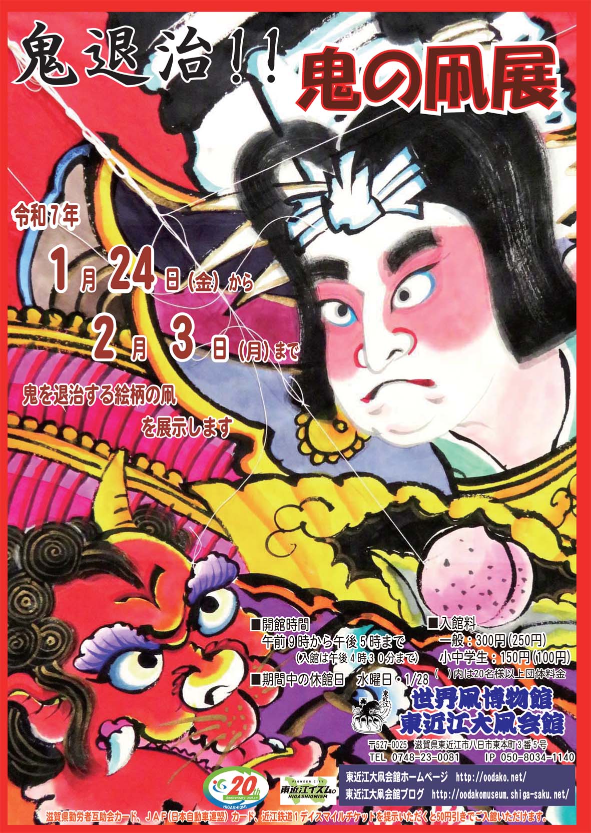 東近江大凧会館では、節分にちなみ、鬼が描かれた凧を展示します。