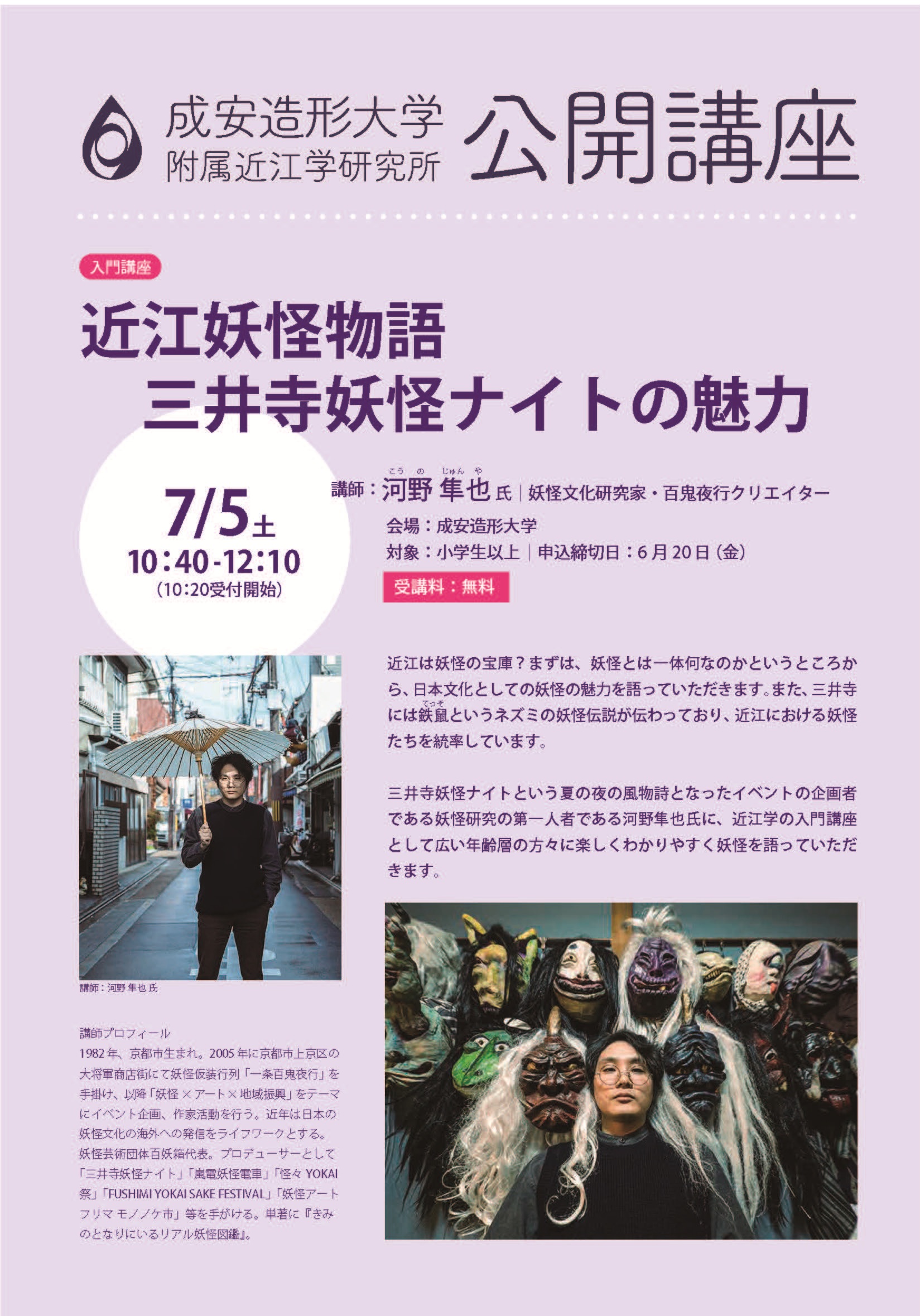三井寺妖怪ナイトという夏の夜の風物詩となったイベントの企画者である妖怪研究の第一人者である河野隼也氏に、近江学の入門講座として広い年齢層の方々に楽しくわかりやすく妖怪を語っていただきます。