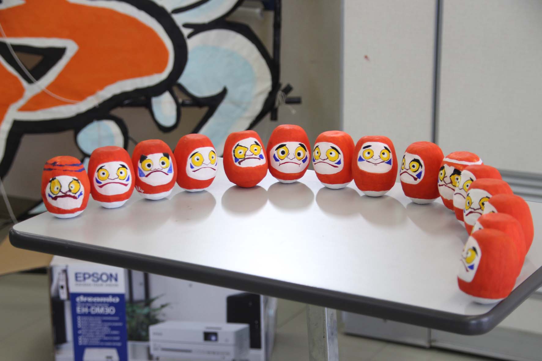 体験教室では、白い張り子のだるまに絵付けをしていただきます。顔の型紙を使用し、顔の下絵を仕上げてから絵付けします。