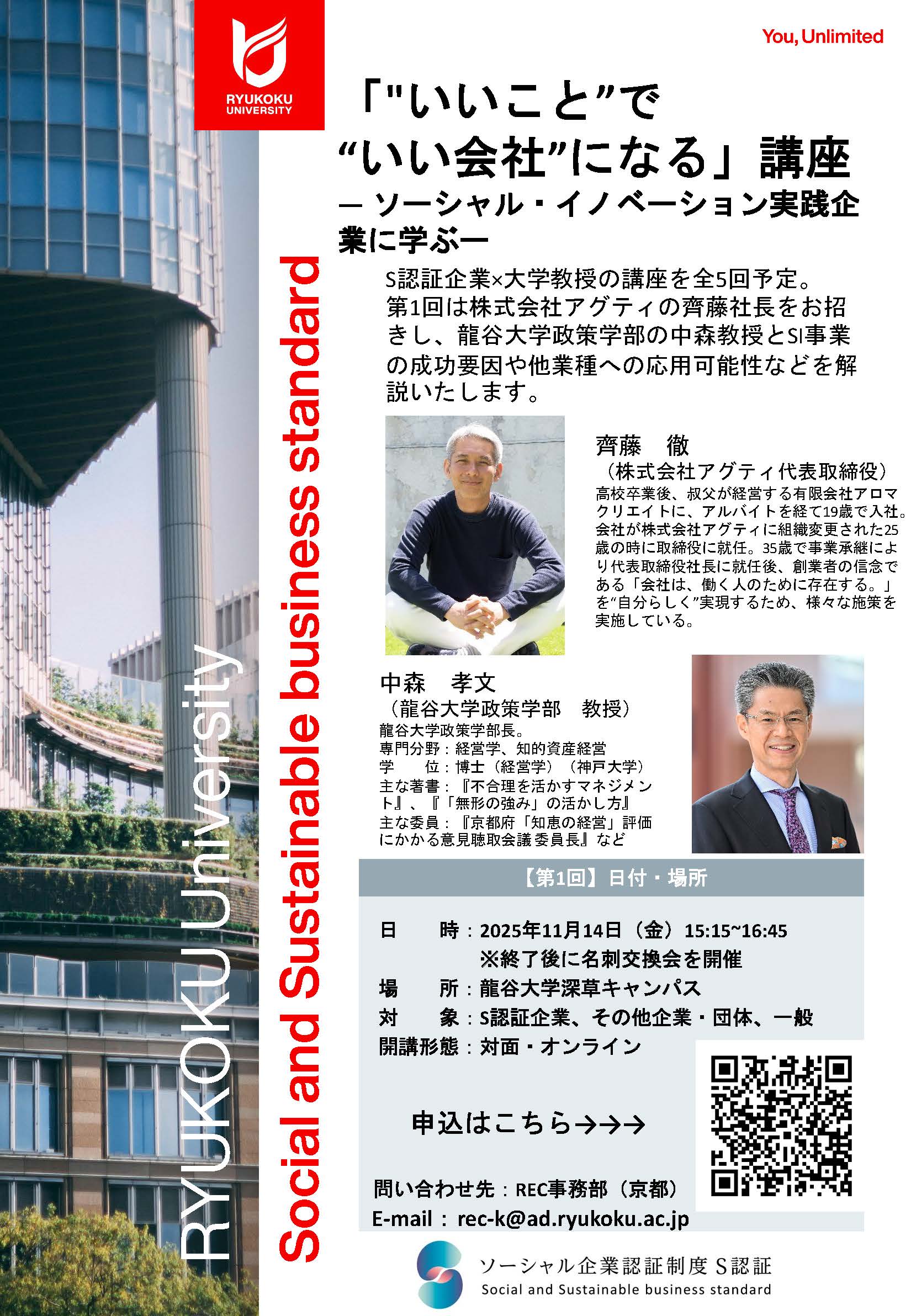 まず、「S認証」を取得した株式会社アグティの齋藤社長による、取組内容や想い、工夫と成果の紹介があり、続いて、龍谷大学政策学部の中森教授が、知恵を活かす経営(不合理を活かす経営)の視点から成功要因や他企業への展開可能性を解説します。