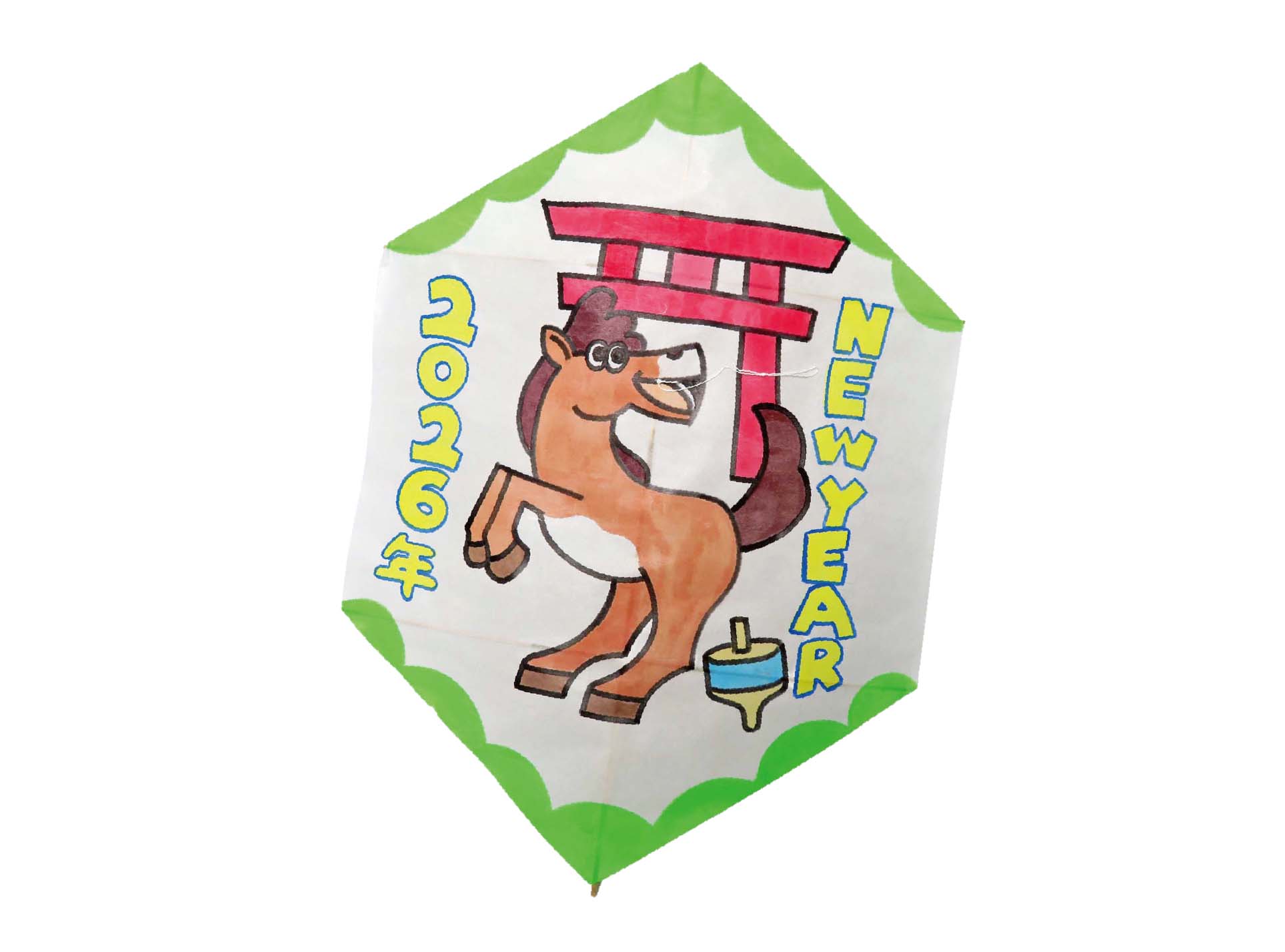 令和8年(2026年)の干支である「午(うま)」が描かれた凧を親子で作ります。完成した凧で1月11日開催の「新春凧揚げ大会」で参加しよう。
