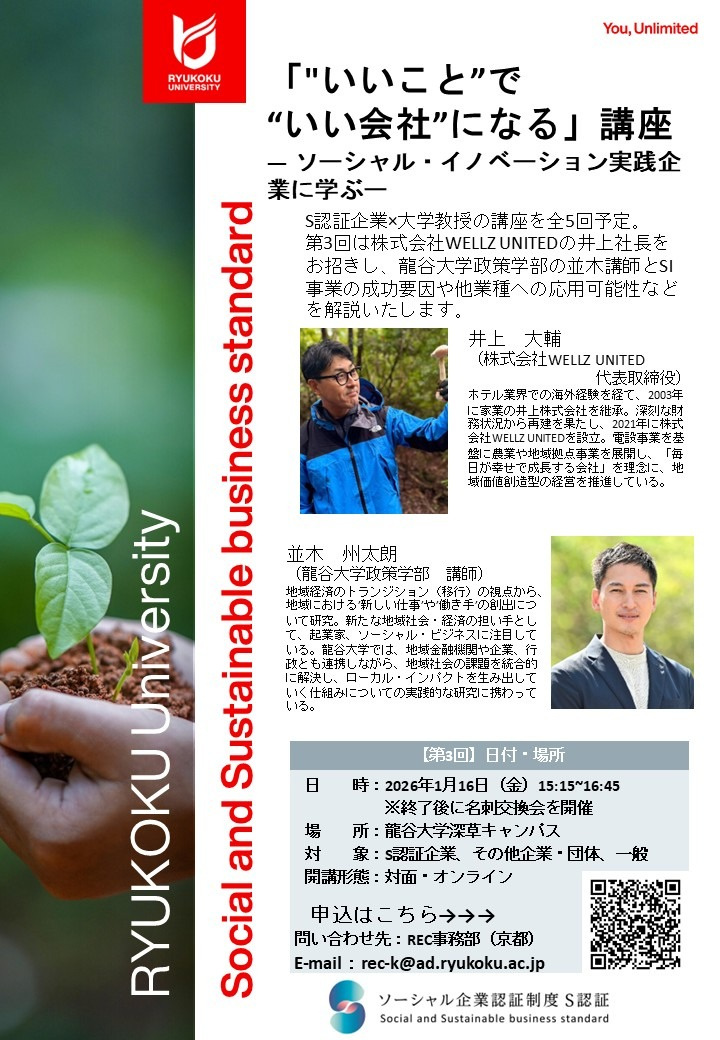 まず、「S認証」を取得した株式会社WELLZ UNITEDの井上社長による、取組内容や想い、工夫と成果の紹介があり、続いて、龍谷大学政策学部の並木講師が、地域経済政策、ソーシャルビジネスの視点から成功要因や他企業への展開可能性を解説します。