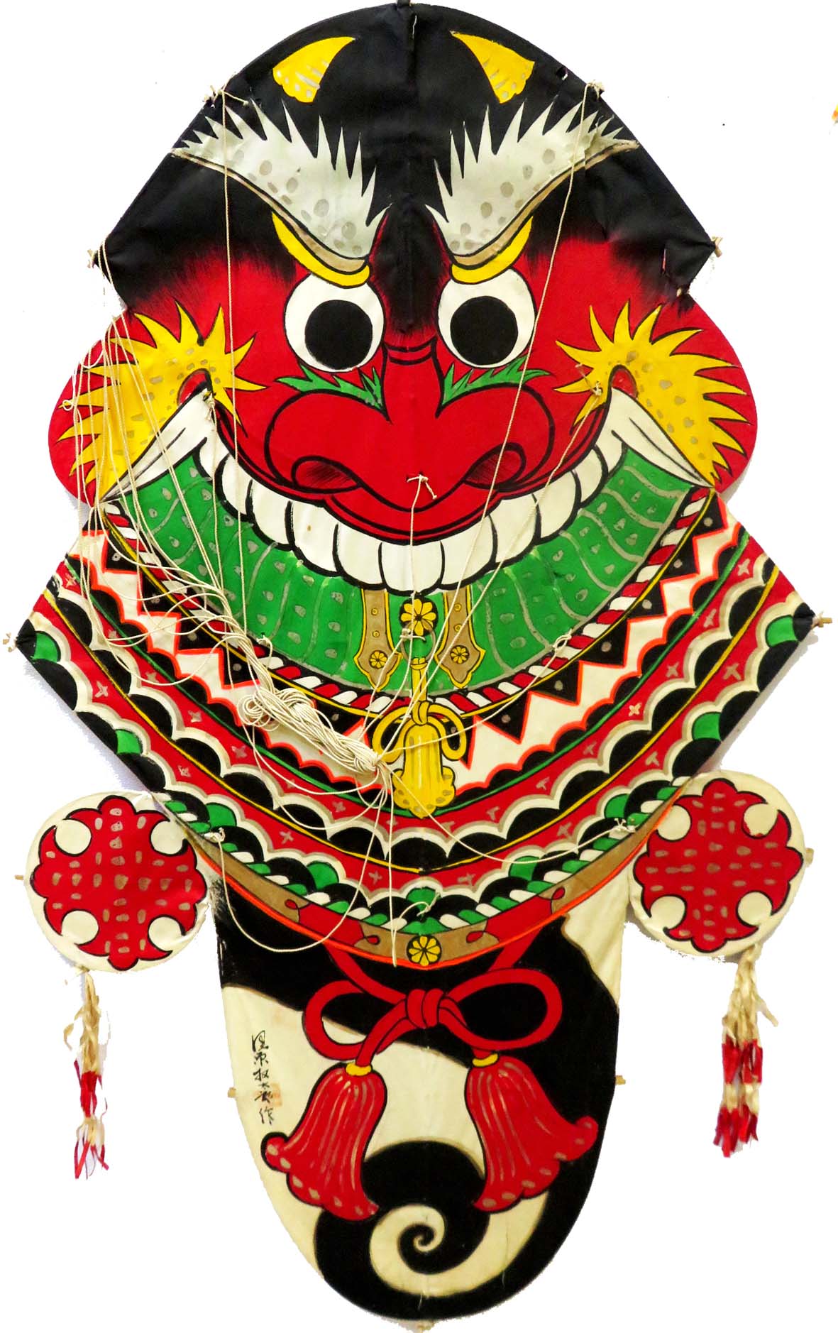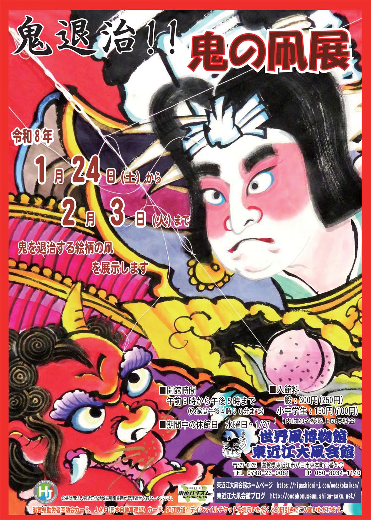 東近江大凧会館では、「節分」にちなみ、迫力のある鬼が描かれた凧を約25点展示する「鬼退治!!鬼の凧展」を、令和8年1月24日(土)から2月3日(火)まで開催します。館内には、京都の大江山で源頼光が鬼退治する絵柄の凧、涙を流すのを表した紅白の房を鬼の目に取り付け、「優しい心も持って鬼のように強く育ってほしい」という子どもの成長を願った山口県見島の「鬼ようず」、鬼が武者の兜に噛み付いた鬼伝説の姿を描いた長崎県壱岐地方の「鬼凧」、同じく長崎県五島列島から鬼が兜を咥えている図柄で、武者が勇敢に鬼に立ち向かっている図柄が描かれている「バラモン」など、様々な鬼の凧を展示しています。