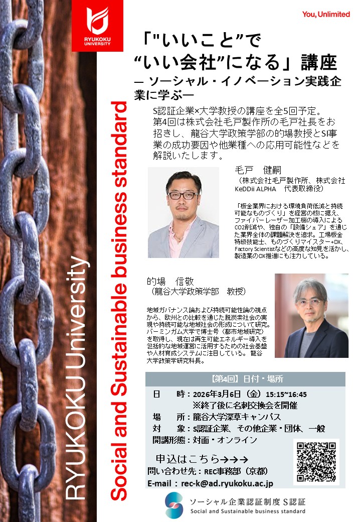 まず、「S認証」を取得した株式会社毛戸製作所の毛戸社長による、取組内容や想い、工夫と成果の紹介があり、続いて、龍谷大学政策学部の的場教授と対談形式で、ソーシャルビジネスの視点から成功要因や他企業への展開可能性を解説します。