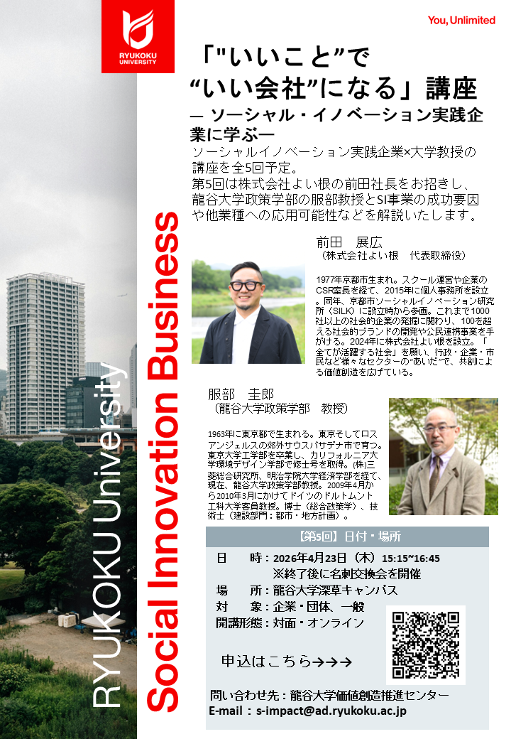 まず、株式会社よい根の前田社長による、取組内容や想い、工夫と成果の紹介があり、続いて、龍谷大学政策学部の服部教授と対談形式で、ソーシャルビジネスの視点から成功要因や他企業への展開可能性を解説します。